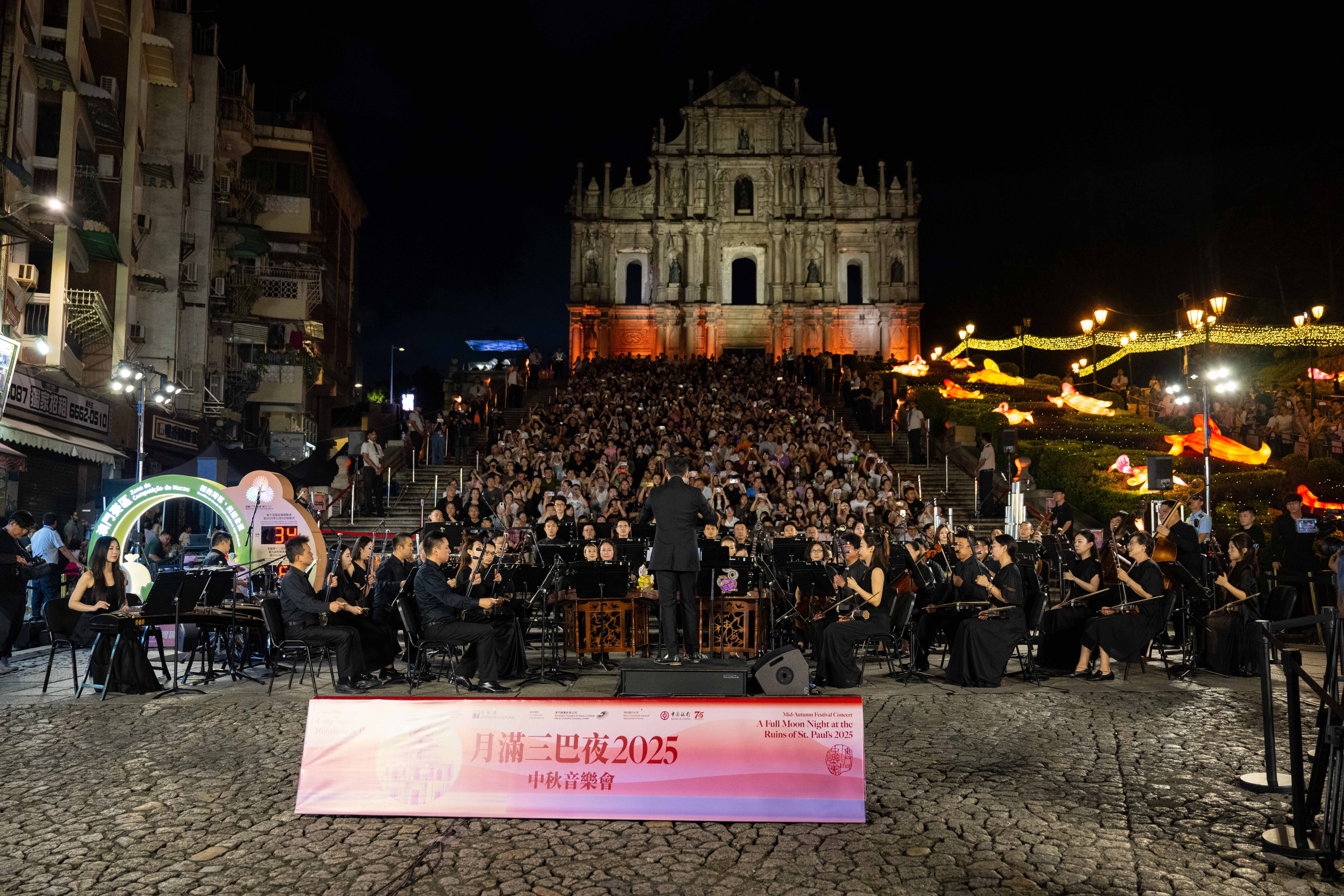 10月6日拍摄的在大三巴牌坊举行的“月满三巴夜2025”中秋音乐会。新华社发(张金加摄)在议事亭前地,这一澳门地标性景点游人如织,在国旗、花朵和灯饰装置的点缀下,呈现一派欢乐景象。沿着葡式碎石路前行,不久就到了大三巴牌坊。只见牌坊前的窄窄一条小巷子人来人往,两旁的商家则摆开架势,热情招呼着过往旅客试吃选购。